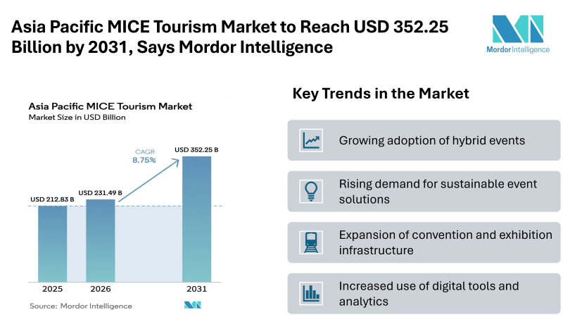 According to Mordor Intelligence, the Asia Pacific MICE Tourism Market size is expected to grow from USD 212.83 billion in 2025 to USD 231.49 billion in 2026, and further reach USD 352.25 billion by 2031, registering a CAGR of 8.75%. This steady market growth reflects improving corporate confidence, increasing international collaboration, and the return of large-scale meetings and exhibitions. The industry is benefiting from a balanced mix of domestic and cross-border events, as companies continue to rebuild engagement strategies after pandemic disruptions. Countries across the region are investing in modern venues, expanding airline connectivity, and simplifying event logistics to attract global organizers. At the same time, planners are focusing on cost efficiency and flexibility, which is encouraging the adoption of hybrid formats that combine physical and virtual participation.