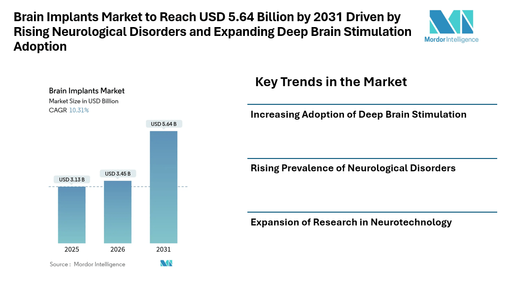 According to Mordor Intelligence, the brain implants market size is valued at USD 3.45 billion in 2026 and is projected to reach USD 5.64 billion by 2031, growing at a CAGR of 10.31% during the forecast period. The growth of the brain implants market is primarily supported by the rising prevalence of neurological disorders, increasing demand for minimally invasive neurosurgical procedures, and expanding adoption of deep brain stimulation therapies.