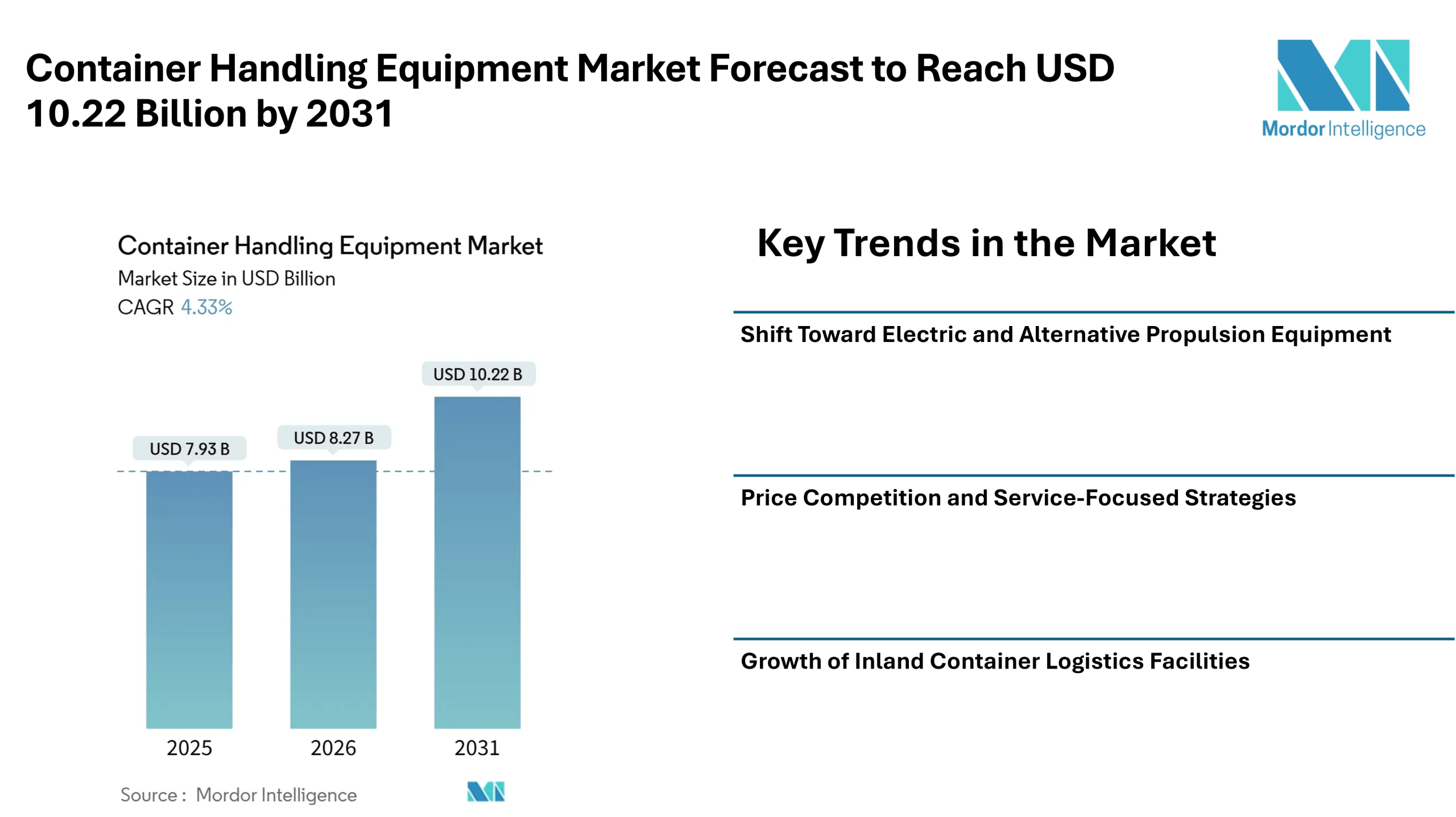 According to Mordor Intelligence, the container handling equipment market size is expected to grow from USD 7.93 billion in 2025 to USD 8.27 billion in 2026, with the container handling equipment market forecast indicating it may reach USD 10.22 billion by 2031. This progress reflects consistent investments in cargo handling infrastructure and modern equipment used in terminals, depots, and freight facilities worldwide.