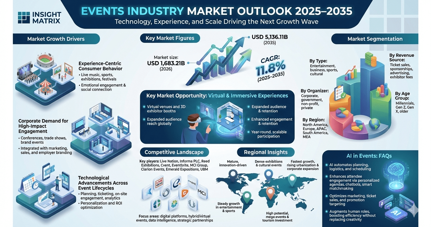 The Events Industry Market encompasses a wide range of activities, including corporate events, exhibitions, trade shows, music festivals, sports events, and private celebrations. As businesses and consumers increasingly prioritize immersive experiences, the demand for professionally organized and technologically enhanced events continues to rise. The market report coverage includes detailed insights into revenue forecasts, competitive landscape, growth factors, and emerging trends shaping the future of the industry.
